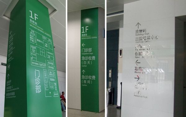 為了更形象、更準(zhǔn)確的表達(dá)位置,通常在標(biāo)識導(dǎo)向的設(shè)計中多采用圖形、簡短準(zhǔn)確的文字來展示。現(xiàn)在醫(yī)院的標(biāo)識一般有標(biāo)準(zhǔn)的圖形及圖標(biāo),文字方面涉及到中英文,也有代表地域的文字,常見的有蒙文、繁體字等。