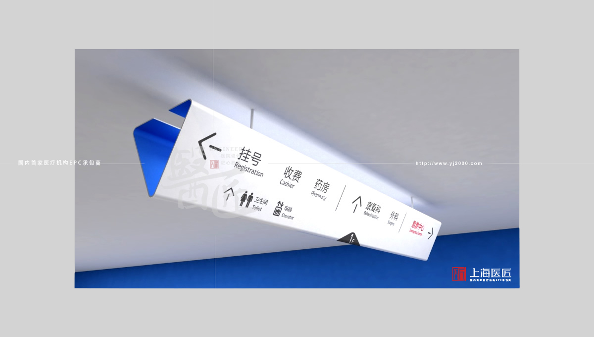 標(biāo)識(shí)導(dǎo)視系統(tǒng)設(shè)計(jì)以深藍(lán)為主色調(diào),讓整個(gè)空間寧?kù)o和諧,襯托出醫(yī)院對(duì)患者關(guān)愛(ài)之情,同時(shí)給人明快、清爽的感覺(jué)。整體簡(jiǎn)潔大方,便于識(shí)別應(yīng)用,很讓人印象深刻。